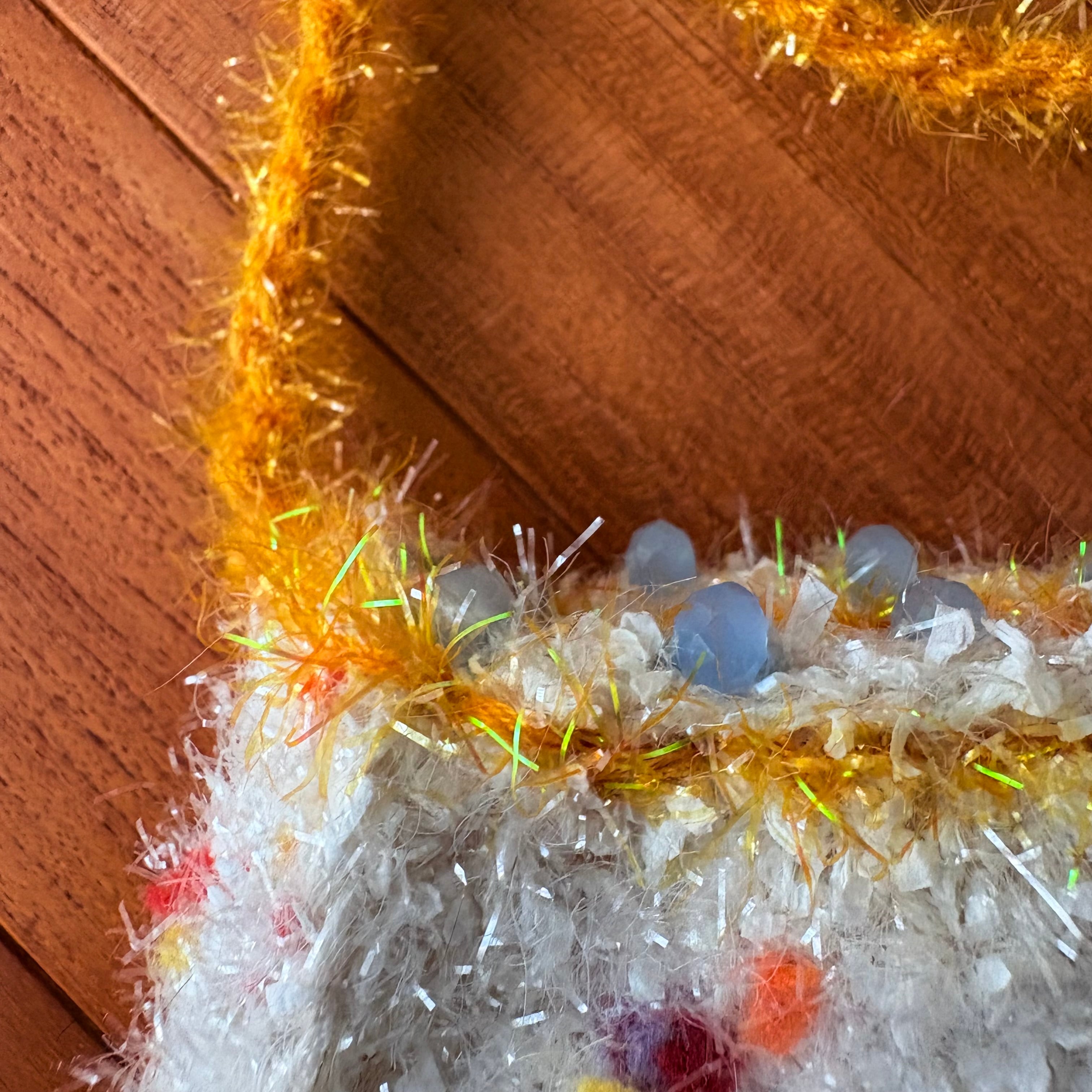 このBAGはキラッキラの白い糸とオレンジをツートーンに。白い糸にはマルチカラーのつぶつぶが入った糸を合わせました。ちょっとレトロな感じがかわいくて❤︎