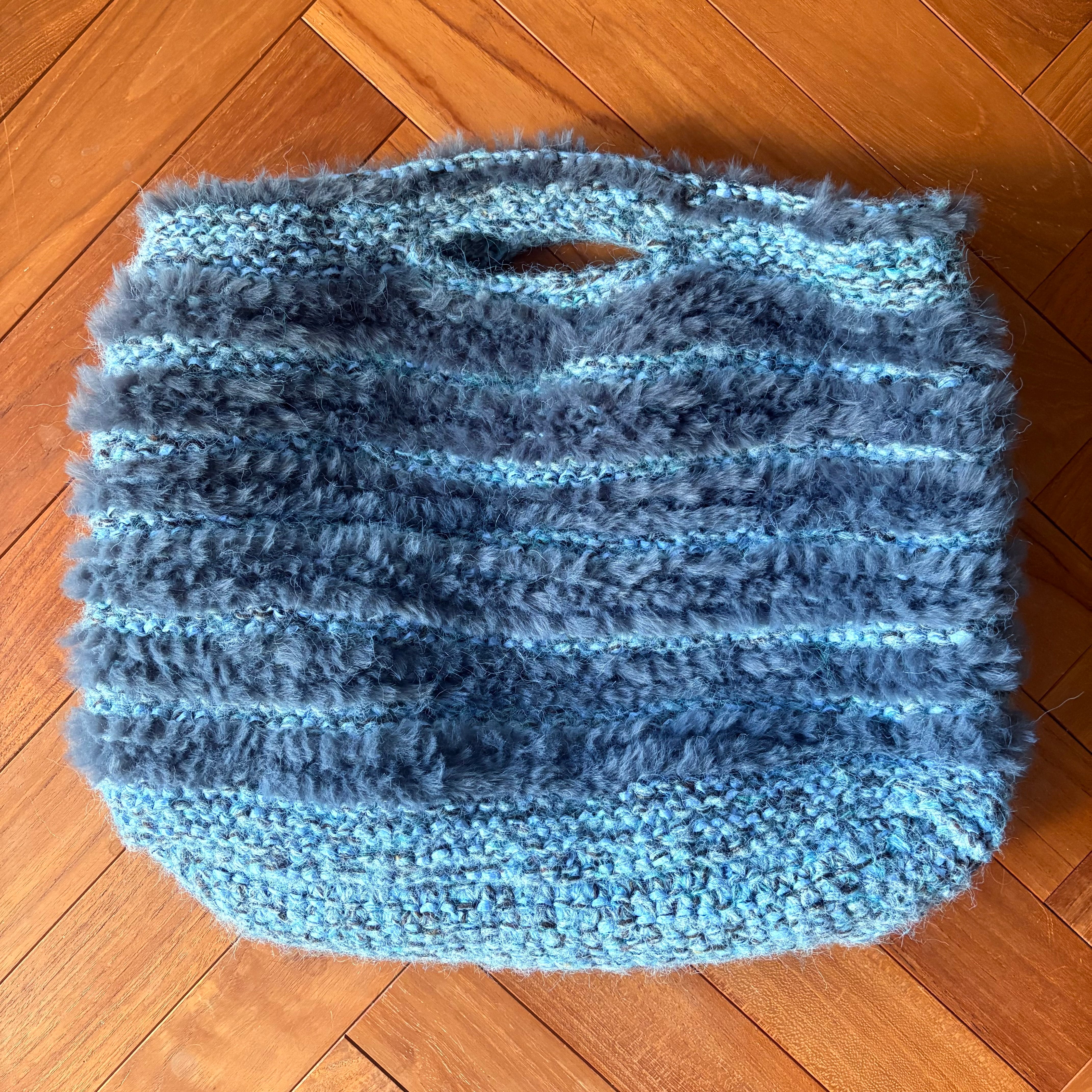 グレーのファーヤーンと、茶色や水色の色々な糸を合わせてボーダーに編みました。