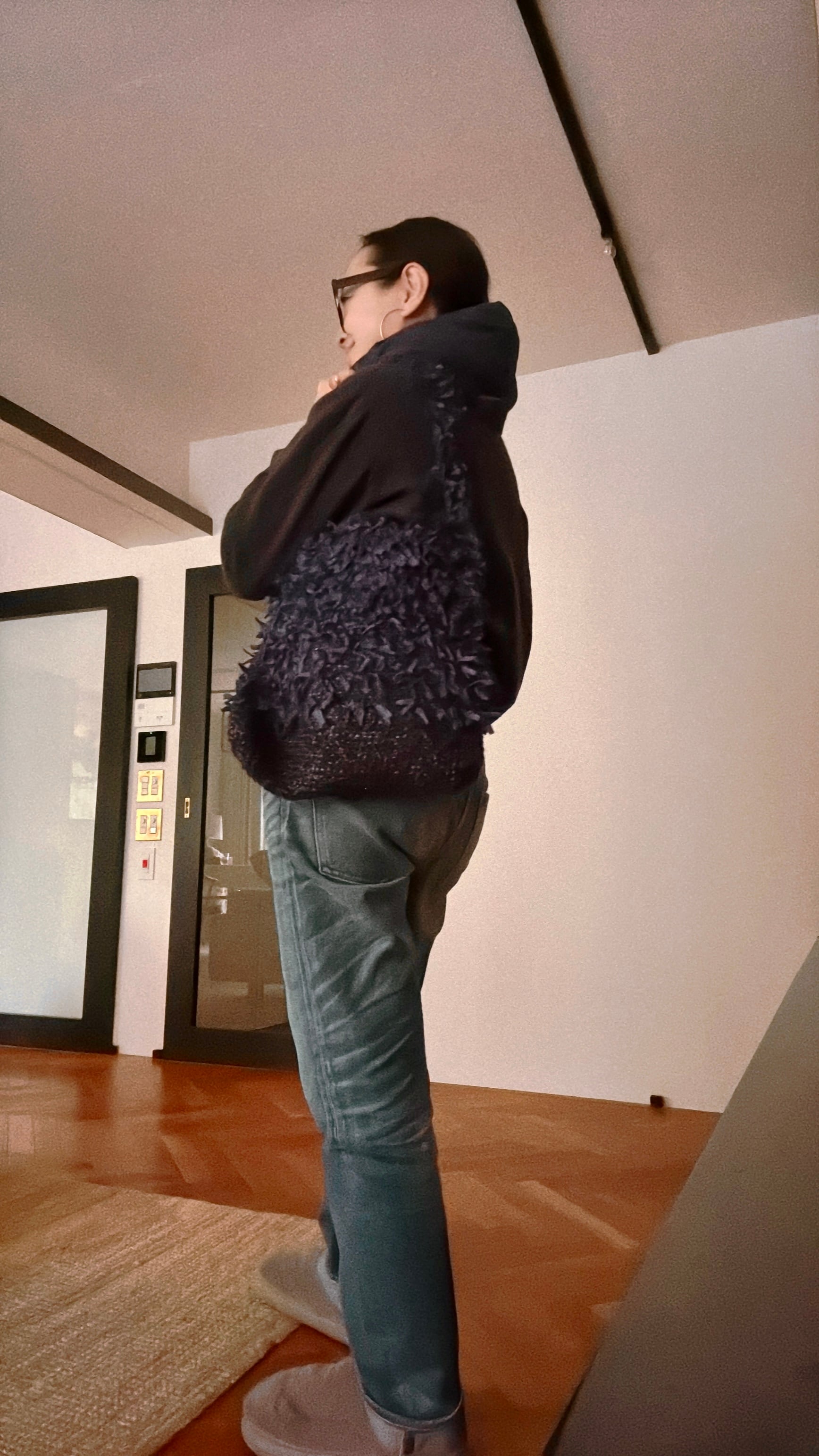 以前、このリボンヤーンが人気すぎて、何個も編みましたが、もうこの色も在庫がわずかとなり、もう一つワンショルダーのトートバッグを編みました。